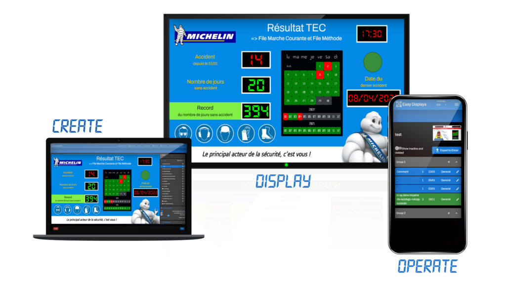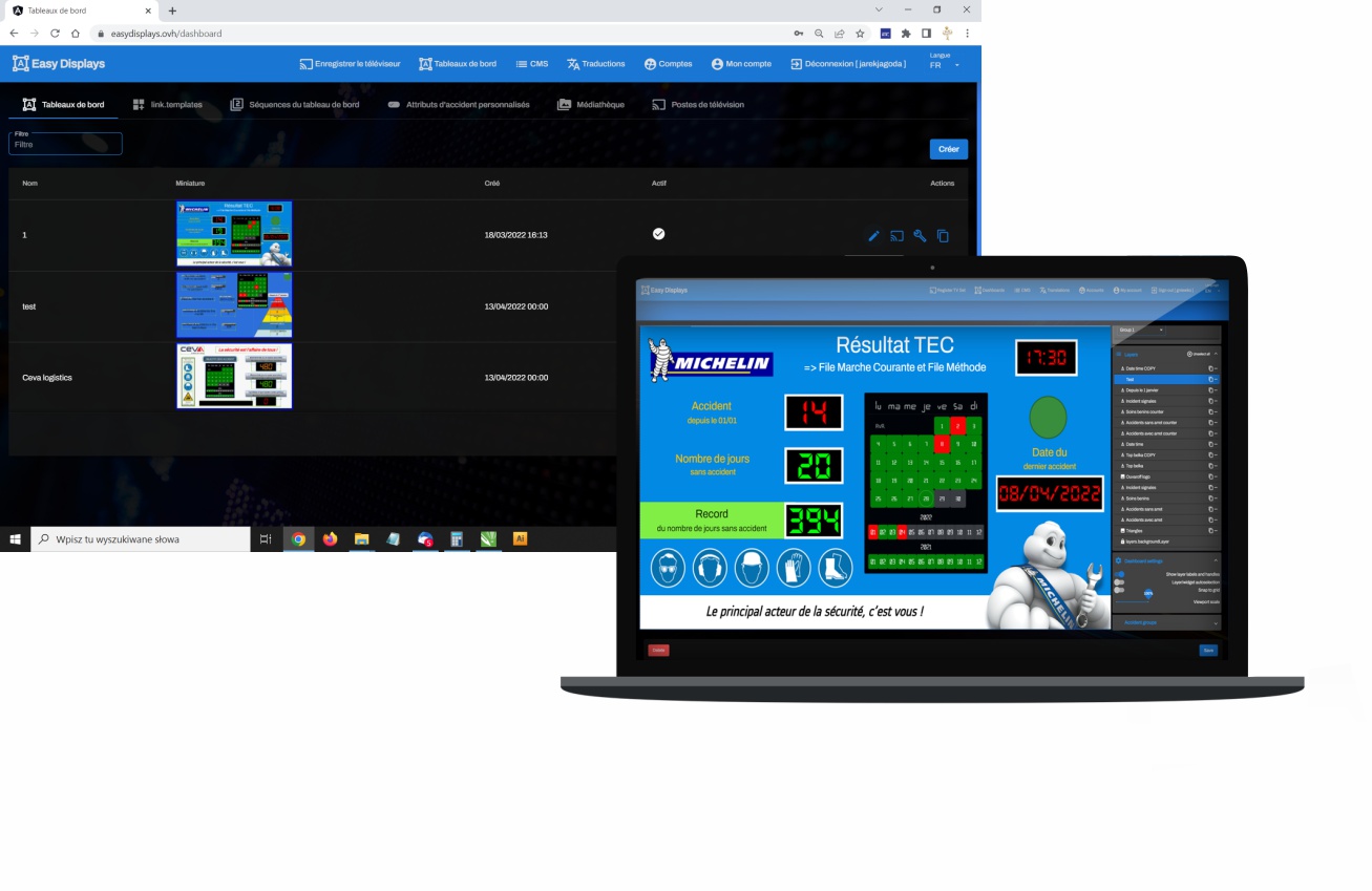 Using our software, you can easily create your own dashboard. You can also use the available ready-made templates. Select functional displays (date, time, accident counters or accident calendar) and add them to the dashboard. Personalise the look by adding logos, photos, text, etc.