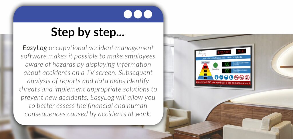 AD-Log’s purpose is not only to display, on the TV screen, information concerning accidents or prevention information. One of the most Important features of the software is the ability to describe and categorize accidents in detail and creating reports.