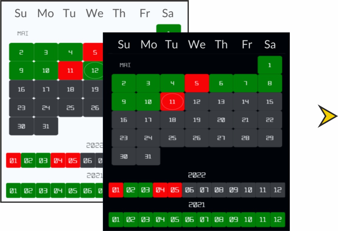 The calendar works automatically, turning the box of the present day into green. Declaring an accident causes the box of the present day to change from green to red, and thus the box for the present month to change from green to red (unless an accident has already occurred in a given month). On January 1, the colours of the windows from the calendar of the months of the current year automatically switch to the calendar of the months of the previous year.
