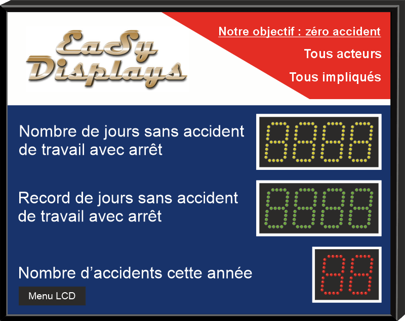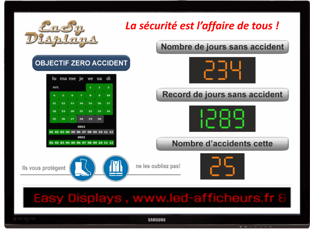 AD-Log est un logiciel unique permettant de créer des panneaux personnalisés « Jours sans accident » et de les afficher sur des supports numériques (TV, moniteurs industriels).