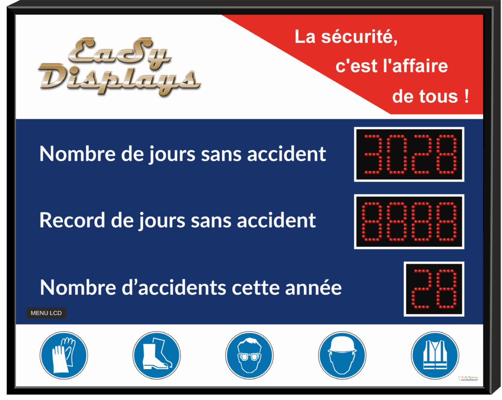 Les panneaux « Jours sans accident » de ces quatre gammes sont disponibles en quatre formats fixes : 50×40 cm, 73×49 cm, 80×60 cm et 100×80 cm.